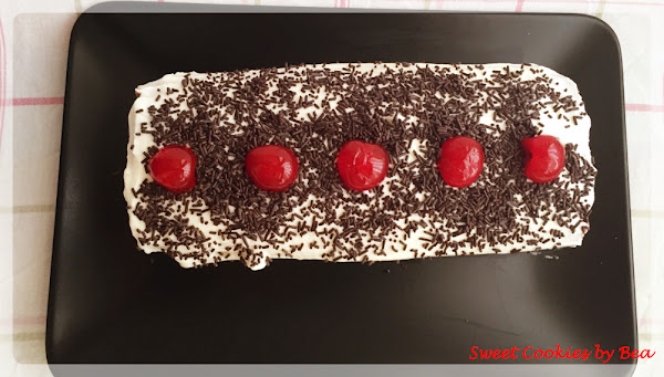 Con sus virutas de chocolate, las cerezas, la nata (crema de leche) el bizcocho de chocolate.... y encima bien fresquita