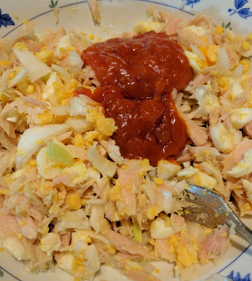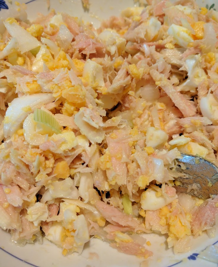Para la mayonesa casera: aceite de oliva suave, vinagre, 2 huevos, sal rosa del HimalayaA continuación todo el proceso