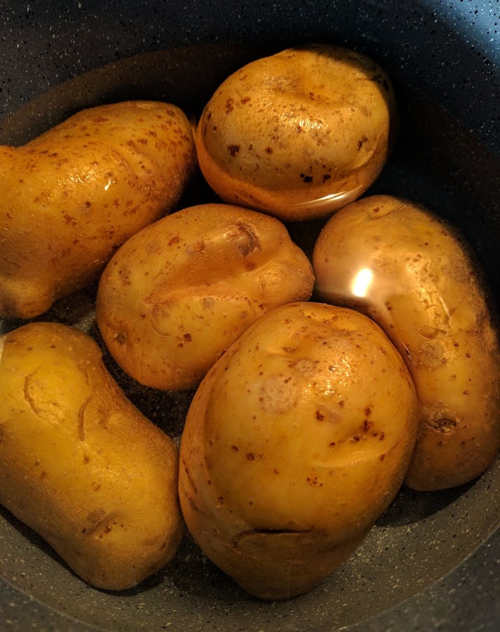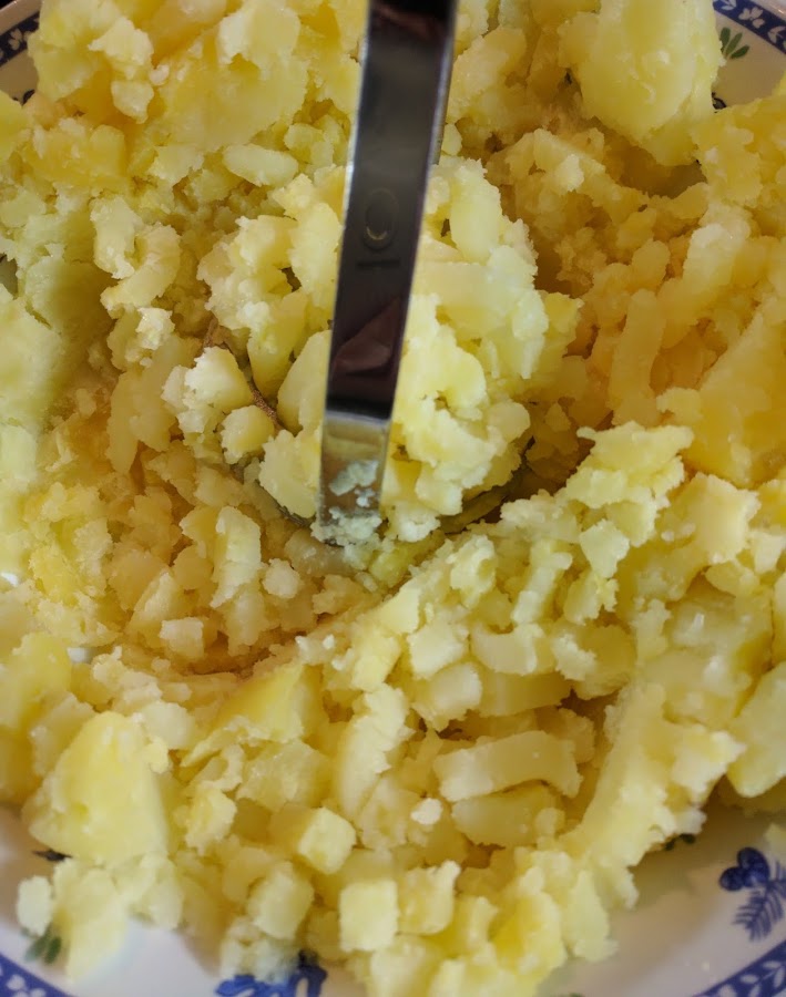 Pela y aplasta las patatas. No olvides salpimentarlas