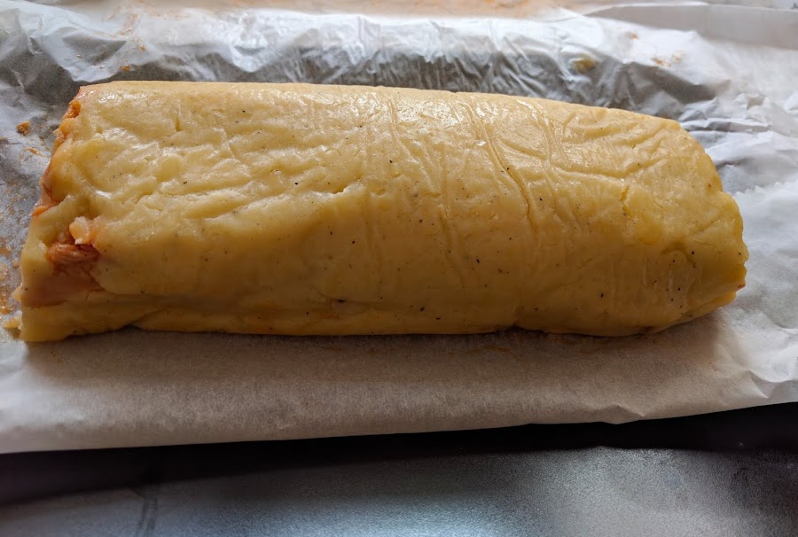 Envolvemos cada mitad, cortando el papel. Hay que tener cuidado para que no se rompa. En las bandejas metemos en la nevera unas cuantas horas o hasta el día siguiente