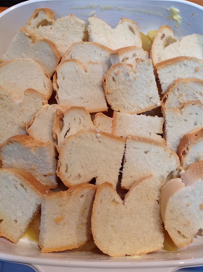 Ponemos el pan sobre las peras, con la mantequilla hacia abajo, y hacemos filas superpuestas. Yo usé pan tipo bollo, que es el que de verdad se me pone duro en casa y no tengo que comprar nada de croissants, ni brioche ni nada de eso. Cuando compro croissants o brioche no se me ponen duros nunca, nos los comemos antes, os lo aseguro.