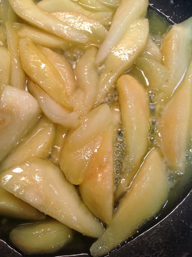 5 peras maduras, peladas, descorazonadas y cortadas en octavos (yo utilicé Conferencia)