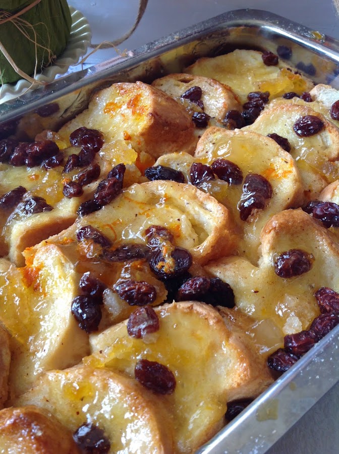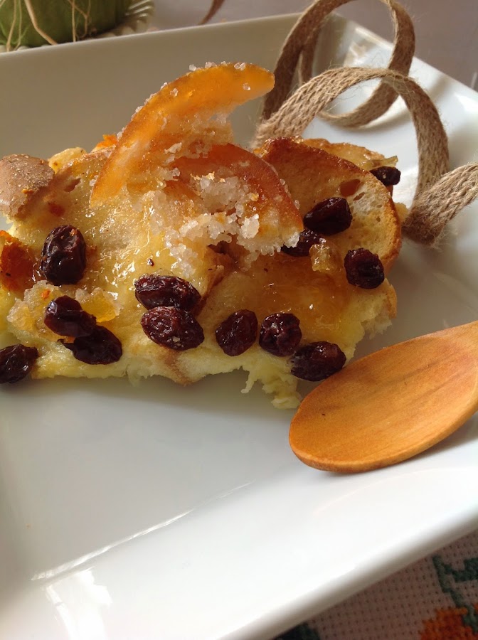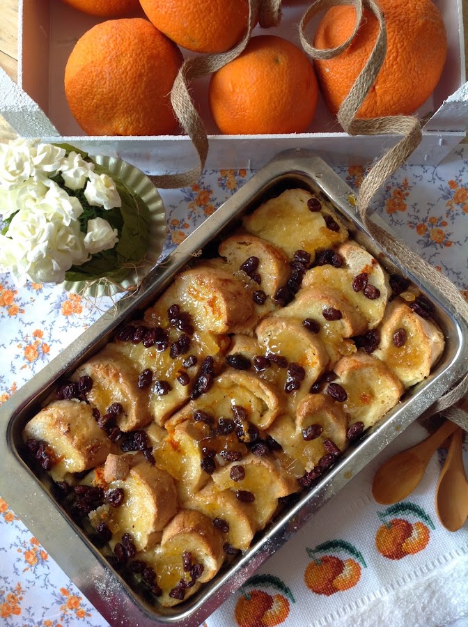 BREAD AND BUTTER PUDDING DE NARANJAS CONFITADAS Y PASAS