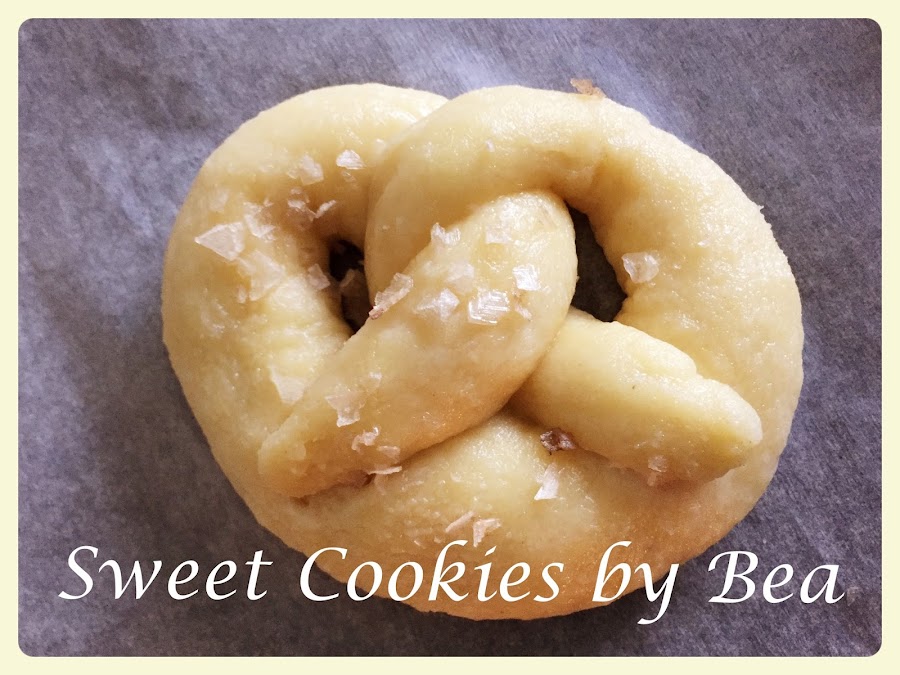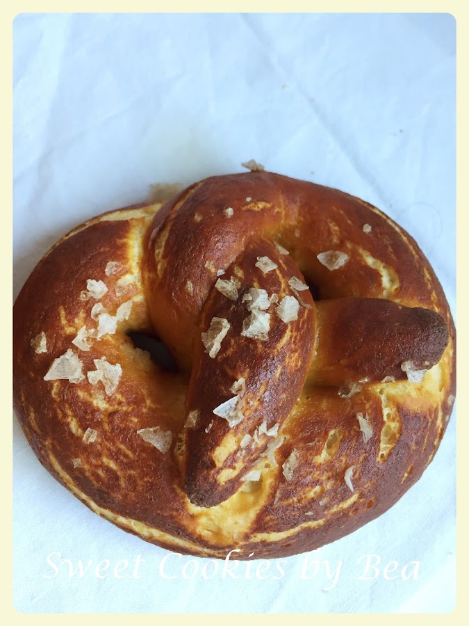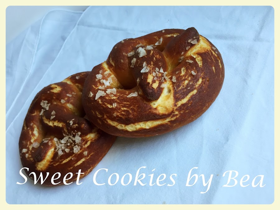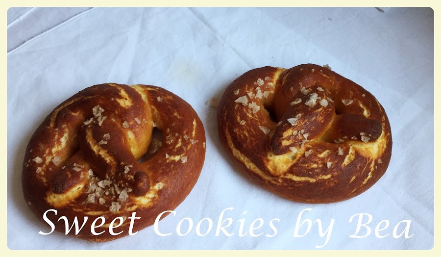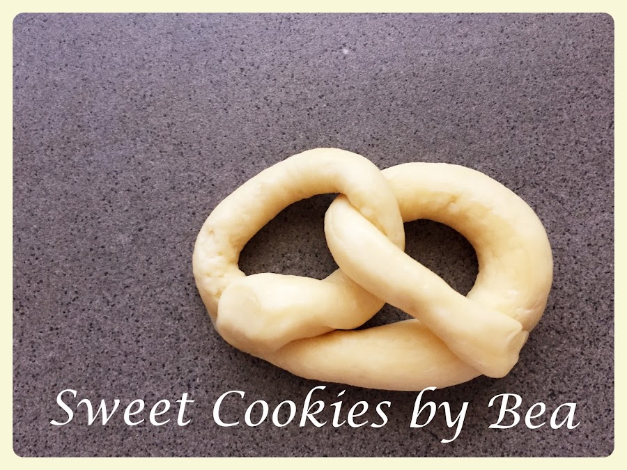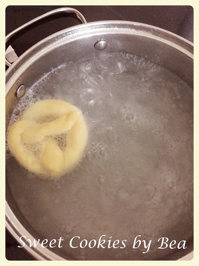 La receta original se baña con sosa cáustica disuelta en agua antes de hornear, pero o he usado bicarbonato sódico, esto es para hacer la corteza y que por dentro queden húmedos y tiernos
