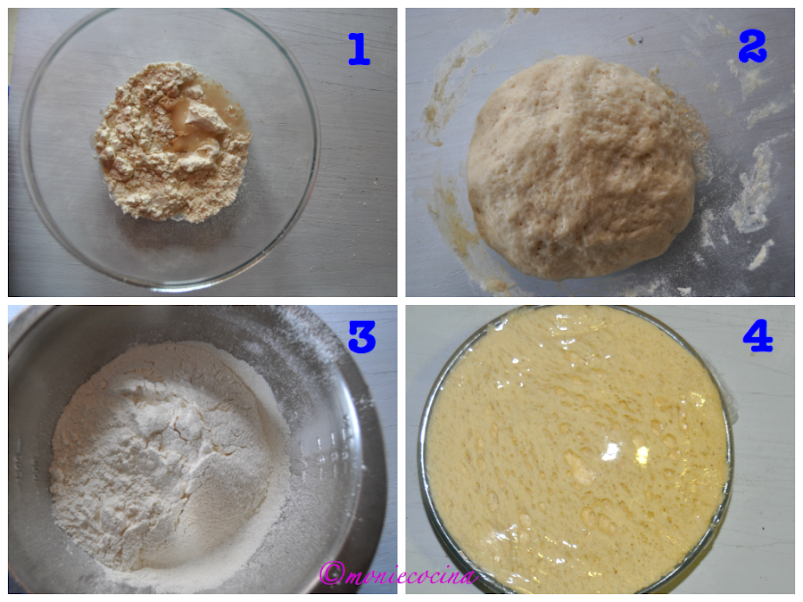 1.- Comenzamos preparando el primer levado. En un bol mezclamos la harina, la levadura seca, el azúcar y el agua. Mezclamos despacio y dejamos reposar tapado con film transparente una hora.