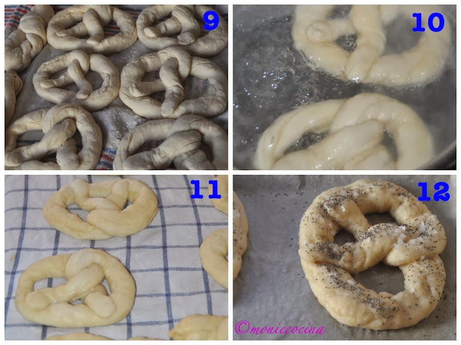 9.- Colocamos los bretzels sobre un paño y dejamos levar una hora. (En este paso, bien tapados con film transparente podemos congelarlos o dejarlos en la nevera para el día siguiente).
