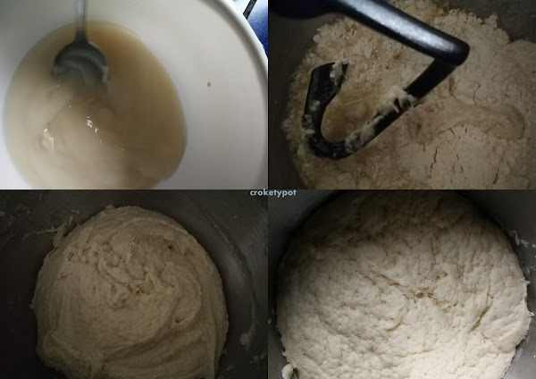 Añadimos la harina tamizada, y la mantequilla, y amasamos a mano o con la amasadora unos 10 minutos. Dejamos la masa hecha una bola reposar a temperatura ambiente tapada con un paño 30 minutos o hasta que doble su tamaño.
