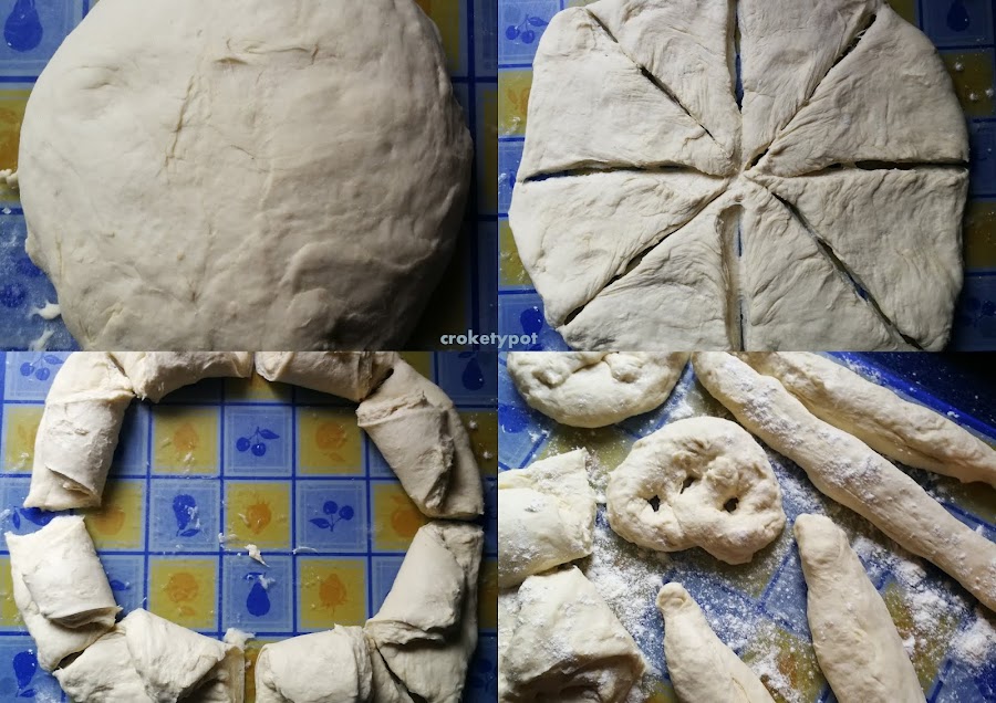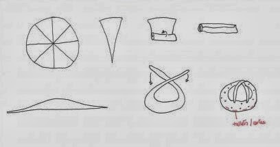 Cortamos en triangulos, y enrollamos las porciones desde el ángulo hacia afuera, hasta que quedan como un churro, siempre con la parte central mas gorda, hacemos el lazo, tal y como explica el dibujo.