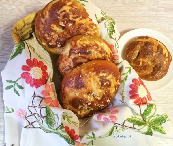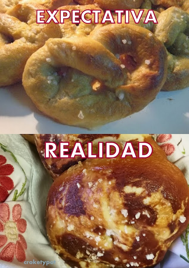 Hay que decir, que mis bretzels han quedado con forma de bollito, muy ricos, pero sin el lazo característico, por ello, el diseño hay que perfeccionarlo. La masa ha subido mucho y luego seguía engordando, y en el horno ha subido un poco más, con imaginación se puede adivinar el lazo.