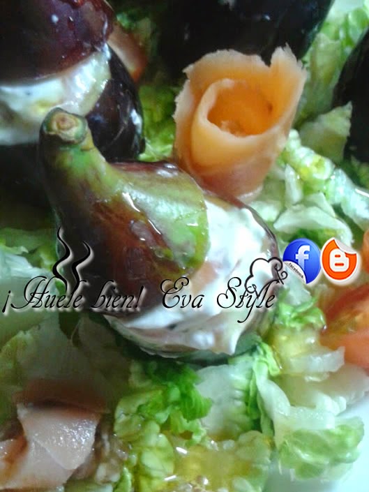 5.- Ponemos una capa de cogollos sobre una bandeja o plato, sobre ellos colocamos las brevas, alrededor de estas los tomates. Rellenamos los cogollos enteros con la pulpa de la fruta. Enrollamos la loncha de salmón, cortamos unos 2 cm. y hacemos la rosa. Decoramos con ella, el centro del plato o fuente. El salmón sobrante lo ponemos sobre la pulpa. Salpimentamos la ensalada, añadimos un chorro de aceite de oliva. Con una cuchara rociamos un poco de miel por encima de la s brevas y la ensalada. Servimos enseguida.