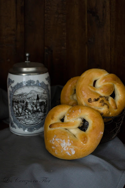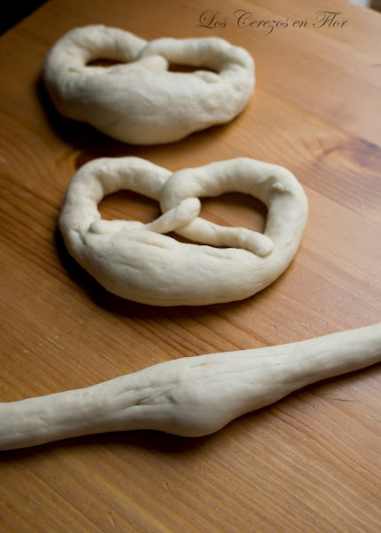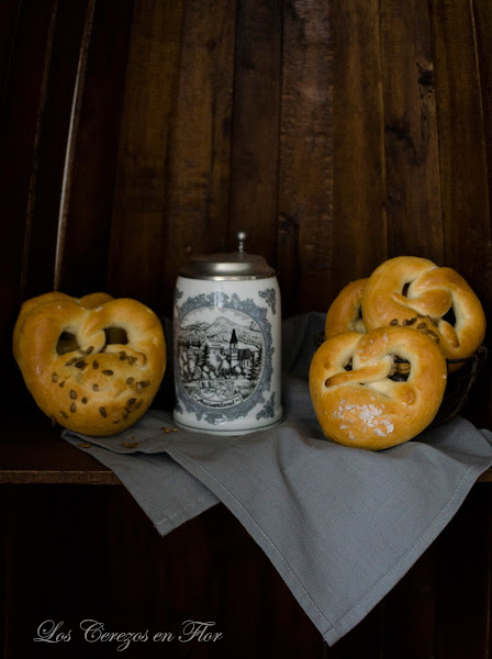 Brezel o pretzel? Pues eso es lo que siempre me he preguntado, porqué dos nombres! La explicación es clara, se puede llamar de las dos formas jajaja, se acabó el misterio. Resulta que el nombre proviene de la palabra alemana Brezel, que significa brazo pequeño. El nombre se lo dieron porque recuerda a dos brazos entrelazados... ahora que lo escribo es muy romántico no?, .... ya me ha salido la vena tontona, ustedes perdonen! Pero la verdad es que de romántico tiene poco, siempre que lo he visto tomar por estas tierras germánicas es por motivo de una fiesta, un aperitivo y siempre a la vera y casi "abrazándose" con una cerveza en un vaso gigantesco y con un partido de fútbol sonando de fondo. Ahora que estamos metidos de lleno en plena Eurocopa he pensado que era el momento perfecto para traeros la receta. Lo cierto es que es un pan que entra solo, no necesita de mucho acompañamiento, para mojar en una salsa o abierto por la mitad con embutido esta la mar de bueno. Mi hija Paula es una enamorada de los brezels, ella no suele comer mucho, tengo mil problemas para que se coma cualquier cosa, pero cuando salimos y vamos a algún mercado, en cuanto los ve, se va para al puesto como atraída por un imán. Hay tropecientas mil recetas en la red y con muy pocas variaciones entre ellas, así que cómo los que yo conozco son los alemanes, pues os traigo una que siempre funciona y que quedan realmente muy buenos. Otro día y si os han gustado os pondré una variante con mostaza que son deliciosos, pero ya más adelante, aquí lo importante es que los hagáis una vez, comprobéis lo sencillo que son y así os entre el gusanillo de preparar variantes para sorprender a los vuestros.