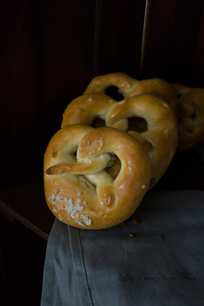 Ayer fue el primer partido de la selección española y me enteré porque mi hijo me mandó un mensaje cuando marcaron el gol, sino ni flowers...no me gusta nada el fútbol, yo soy mucho más de atletismo, esos hombres con espaldas como rascacielos lanzando un disco que puede dejar tuerto a cualquier espectador o ver a ese juez corriendo desesperado por la pista perseguido por la punta de una jabalina cómo si tuviera en el culo una diana no tiene precio. Mi marido es un fanático del fútbol, y recuerdo cómo si fuera ayer la primera vez que me llevó al campo a ver un partido. Imaginaros la escena, asiento en tribuna, rodeado de hombres con puros ( odio el olor y me mareo), todos con transistores pegados en la orejas, soltando improperios sin parar, un frío de la leche ( yo con bragas cuello cisne y ni con esas, tiritando que parecía que tenía el mal de san vito ) y que queréis que os diga, aburrida como una ostra, así que no se me ocurrió otra cosa que sacarme mis cascos y mi libro y evadirme como que todo aquello no iba conmigo. Mi chico cuando me vio así se cogió un mosqueo increíble jajaja, empezó a decir que menudo desperdicio de asiento, que si no tenía sangre en las venas, que tendría que emocionarme con cada jugada, que lo había avergonzado con sus compis de grada, que qué iban a decir de él...jajajajajaja endebé que primarios son los aficionados al fútbol cuando siguen un partido. No volví nunca más. Suerte que en casa tenemos más de una tele, así nunca nos peleamos, cuando toca partido, yo me pongo una de mis series o peli y él a disfrutar con mi hijo. Tengo suerte en un sentido, y es que él no es de los que chilla, ni insulta ni salta sobre el sofá, jajajaja, no no, él mira muy fijamente y cómo mucho mueve la pierna cómo si fuera a chutar pero sin despegar la suela de la zapatilla del suelo, es sólo el gesto. Así que nunca sé si ha perdido o ganado a no ser que baje y me lo cuente. Es un aficionado silencioso y eso me encanta. Eso se merece un premio, y no hay nada como unos brezels con embutido y encurtidos con una buena cerveza para que disfrute del momento. Y para eso no hay nada cómo ponerse el delantal y ponerse manos a la obra para crear éstos geniales "abrazos" salados tan majos. Nos ponemos a hornear?