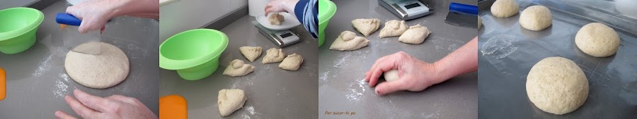 Volcar en la superficie de trabajo y desgasar la masa. Dividirla en porciones iguales, nosotros hemos hecho seis de unos 70 gr. Formar con ellas bolas pequeñas, colocarlas en una bandeja, cubrirlas y dejar reposar unos 15-20 minutos aproximadamente.