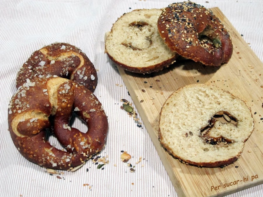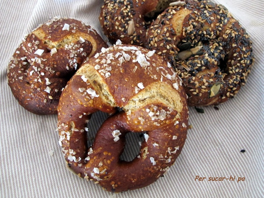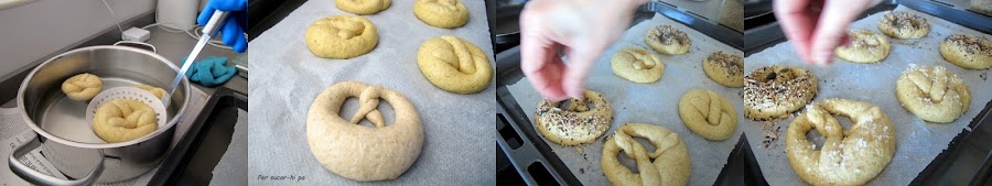 Sumergir los bretzels y bañarlos durante unos 10 segundos aproximadamente. Sacarlos y colocarlos en una bandeja encima de una hoja de papel de hornear. Observar que han cambiado ligeramente de color. Es el momento de espolvorear por encima la sal u otros ingredientes, en nuestro caso semillas variadas.