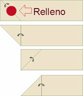 Enrollar como en la receta de briouats y sellar los bordes con huevo batido. Os dejo un croquis de como hacerlo, no es nada complicado.