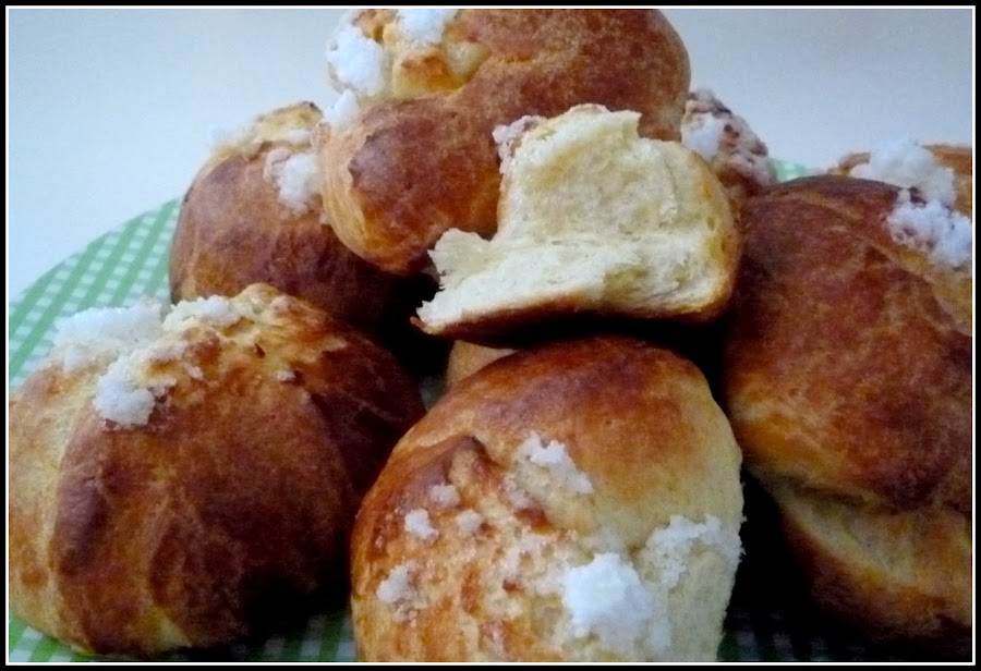 Cuando la sacamos de la nevera esta dura aunque manejable, ya que la mantequilla estará fría. Ahora porcionamos. Boleamos. Pintamos con una mezcla de huevo y un chorrito de nata (crema de leche) y decoramos como queramos. Yo puse un poco de azúcar mojada. Se pueden poner almendras fileteadas, semillas de amapola o de sésamo, etc.