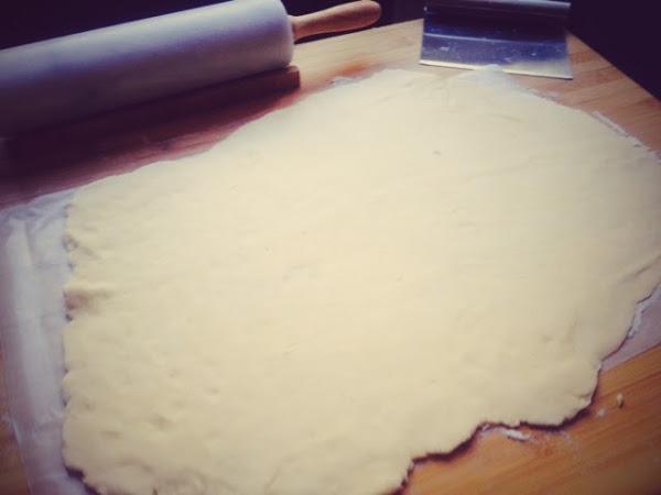 Vamos a trabajar la masa en dos partes, ya que mi mesa de trabajo no es tan grande, además la masa puede resultar un poco pegajosa y así podemos tener mejor control de ella. No se olviden enharinar bien la mesa y al estar estirando, ver que no se pegue por debajo. De hecho yo puse papel encerado, lo enharine y trabaje sobre el.