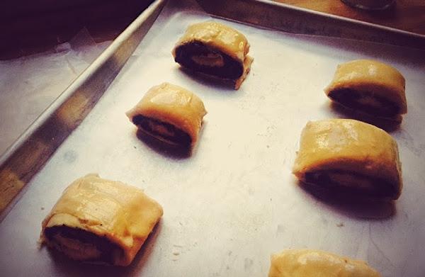 Enharinamos bien nuestra mesa de trabajo y ponemos la mitad de la masa, estiramos y formamos un rectángulo con la ayuda de un rodillo (no es necesario uno perfecto, como ven el mio es casi un ovalo). Agregamos la mitad del relleno y esparcimos por toda la masa. Empezamos a enrollar desde uno de los laterales, cortamos en 10 a 11 piezas, pasamos a la charola. Repetimos el proceso con la otra mitad de masa.