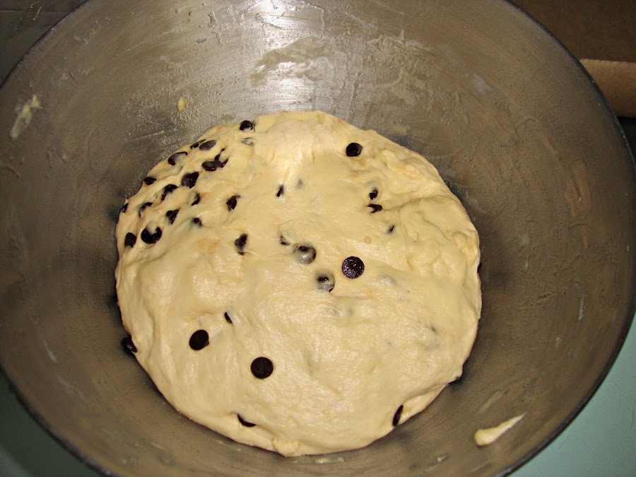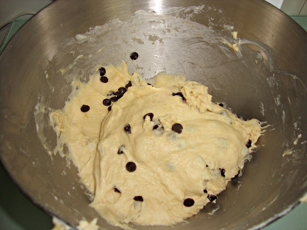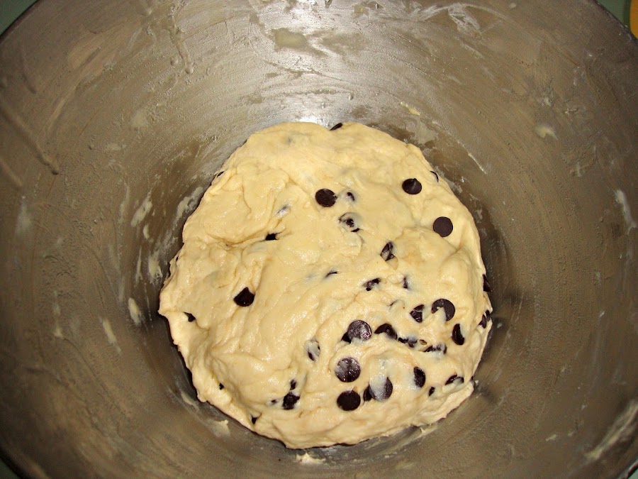 y comenzamos a amasar lentamente y poco a poco le echamos los trocitos de mantequilla, amasamos durante unos 10-12 minutos hasta que veamos que todos los ingredientes están bien mezclados (la mezcla esta pegajosa) y entonces añadimos las pepitas y amasamos uno o dos minutos mas.