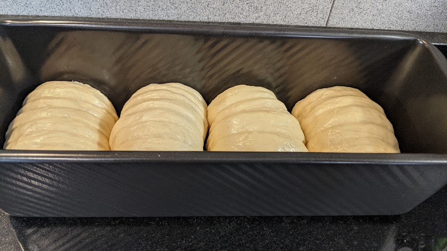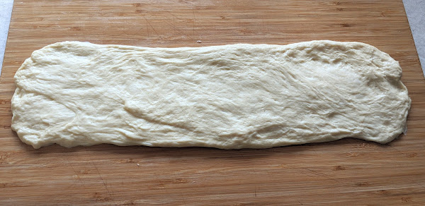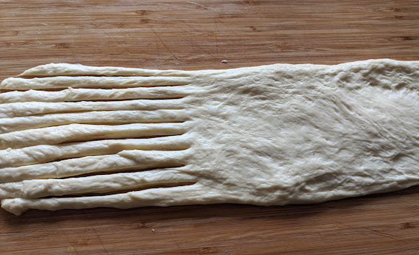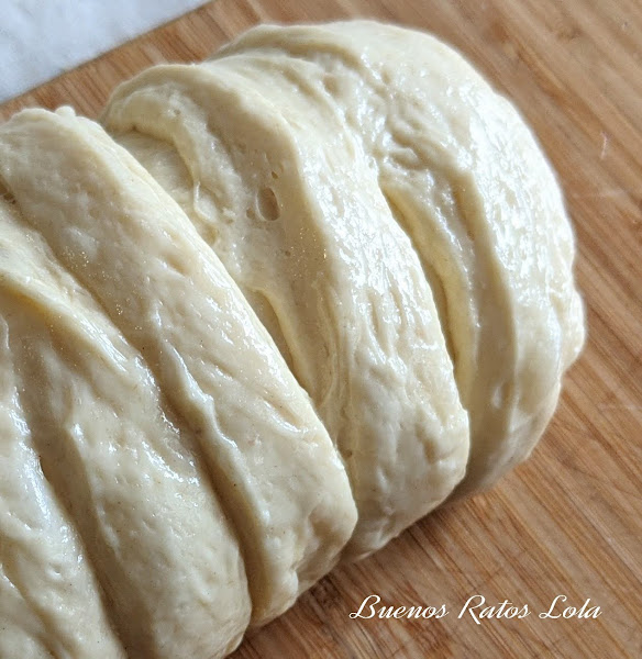 8. Y dividimos en 4 partes. Estiramos cada una de ellas formando un rectángulo y enrollamos. En el último brioche que hice formé de manera algo diferente