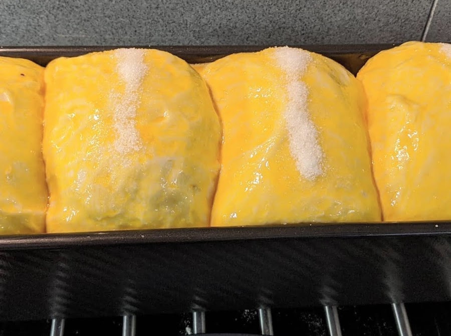 10. El horno ha de estar bien caliente, a unos 200 grados. Pintamos la superficie con el huevo batido y ponemos azúcar. Este último solo lo pinté con leche