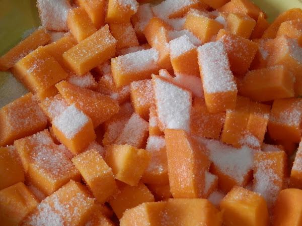 En primer lugar, vamos a poner a asar la calabaza, para ello, pela y quita las pepitas de la calabaza. Quita bien la corteza y mete en el microondas con las dos cucharadas de azúcar por encima, tapa con una tapa especial microondas durante 15 minutos. La potencia: media - alta.