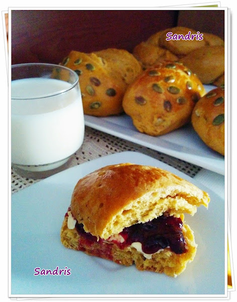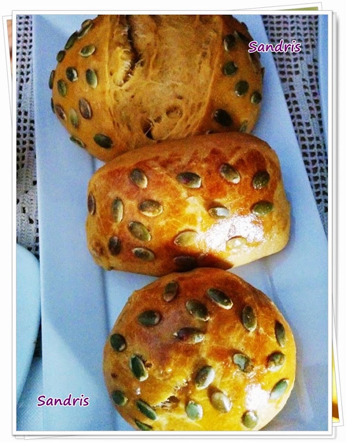 Pero claro... la cabecita se pone a pensar... y digo... uis, pues si la calabaza tal cual no me gusta pero si está cocinada con otras cosas sí... pues porqué no seguir probando a ver si me gusta de otras formas y así al menos es otra forma de comer calabaza... Así que... pensé... y porqué no pan??? Me gusta hacer pan y pan con calabaza igual... como que... debe estar bueno, digo yo :-D Pero esta vez no me apetecía un pan salado. Me venía a la cabeza... un pan así... blandito... dulce... como para los desayunos pero que al mismo tiempo sirva también para ponerle algo dentro salado... Y me puse a buscar por internet... Y encontré el blog de Efi, llamado Entresabores y tatacháaaaaaaaaaaan!!! Lo vi!!! Un brioche de calabaza!!! Perfecto para lo que quería conseguir!!!