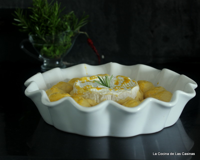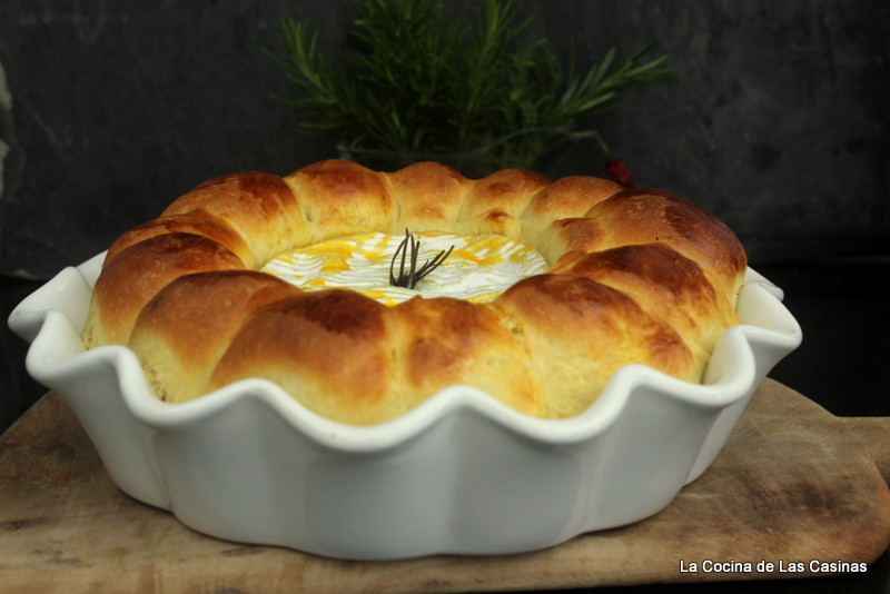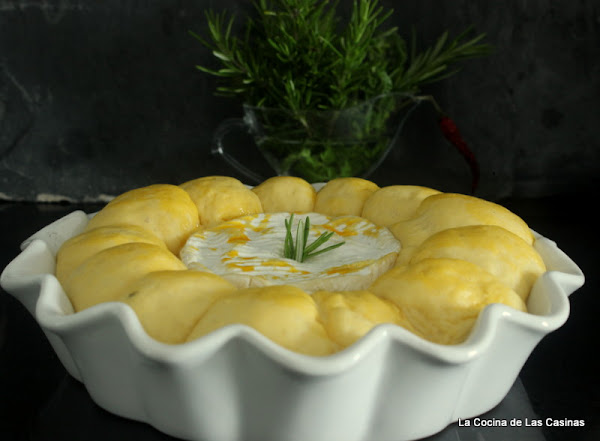 Pincela una fuente apta para el horno con mantequilla diluída, espolvorea un poco de harina, desecha la sobrante. Envuelve el queso por la base y los lados con un poco de masa. Coloca en el centro de tu fuente. Forma pequeños bollitos, rodea con ellos el queso. Si es necesario porque la masa te haya quedado pegajosa, unta las palmas de las manos con un poco de aceite. Pincela con el resto de las yemas. Cubre con el paño de cocina y reserva durante media hora o hasta que doble su volumen. ¿Ves como ha levado?. Es una maravilla. Yo he pinchado en el queso una ramita de romero que le da un aroma estupendo.