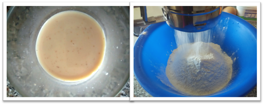 Levadura con leche tibia azúcar y sal (Izq.). Adición de harina tamizada (Dcha.)