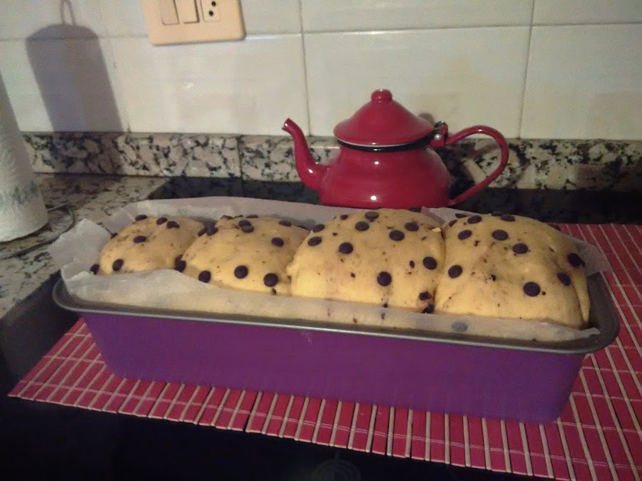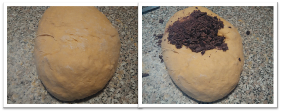 Una vez pasada la hora toca volcar la masa sobre una superficie enharinada. Si sigue estando pegajosa, o si antes no se ha hecho, se puede ir añadiendo más harina, sin pasarse para que la masa no quede muy dura. Una vez tenga la textura requerida, debe de hacerse una bola y en el centro introducir los ingredientes extra que le queramos poner al brioche, en mi caso chocolate. Para mezclarlos bien la técnica es la misma que la de antes, de fuera hacia el centro. Una vez se vea que la repartición ha sido homogénea, se hacen las formas que se quiera (yo hice 4 bollos y una tira larguita en molde rectángular). Hay que tener en cuenta que habrá que dejar la masa reposar una horita más y repartir las masas en cantidad y con separaciones prudentes para que no se peguen entre ellas o desborden por el molde.