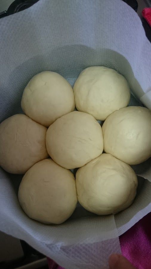 Una vez doblado el volumen, amasamos de nuevo para expulsar el aire y dividimos en porciones de unos 100 gramos. Colocamos en un molde, en mi caso de 20 cm., ponemos papel de horno en la base y a los lados. Vamos poniendo las bolitas formando un círculo y una en el centro. Dejamos levar hasta que vuelva a doblar.