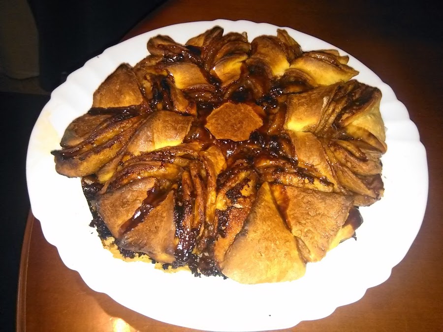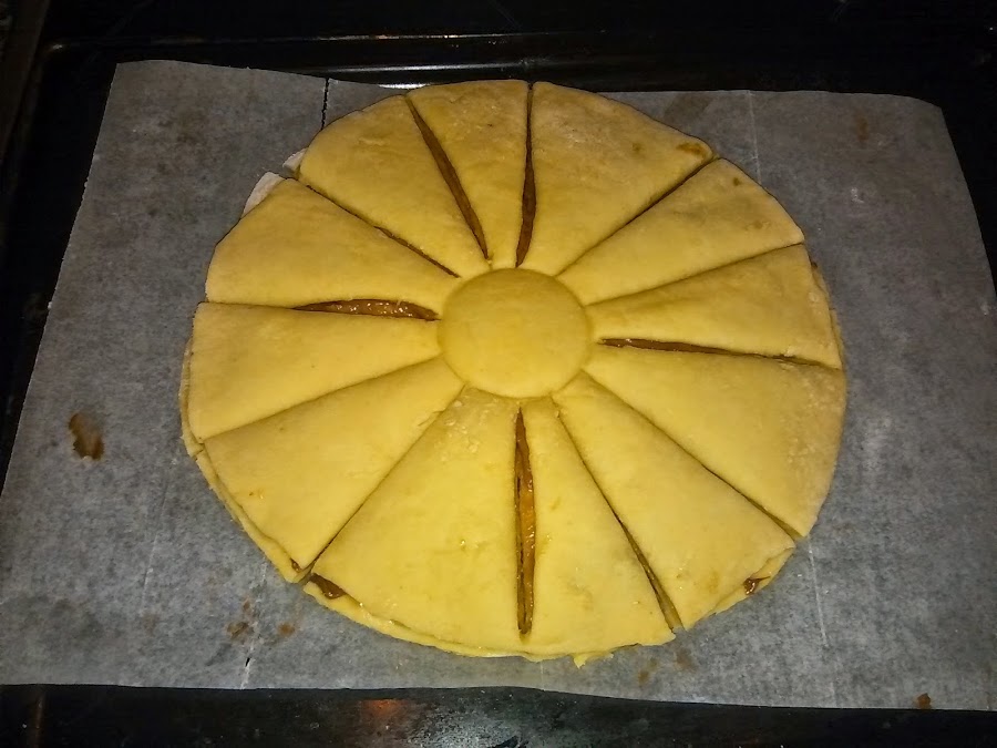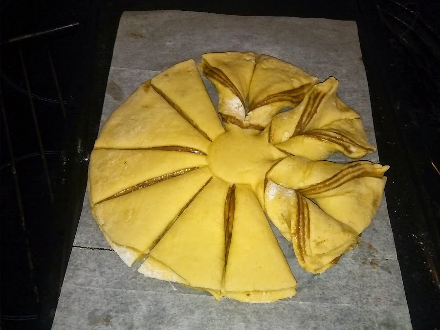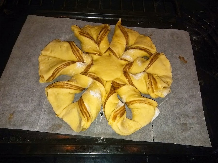 Estas porciones las cogeremos una con cada mano y les daremos dos vueltas hacia fuera y pegaremos las puntitas de ambas a si aremos con las doce porciones consiguiendo que queden en seis, la pintamos con un poco de mantequilla derretida en dos cucharadas de leche y la llevamos al horno el tiempo no lo podría decir pero vosotros controláis que este doradita