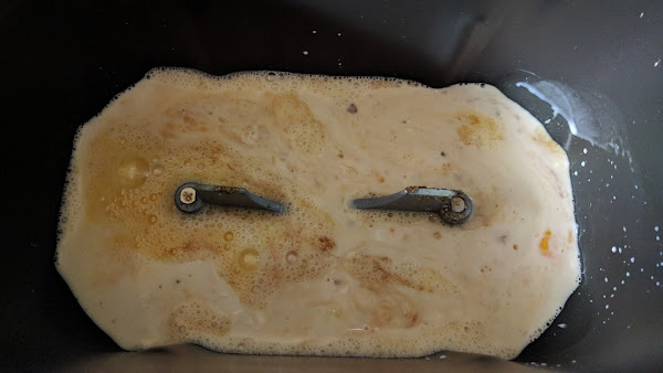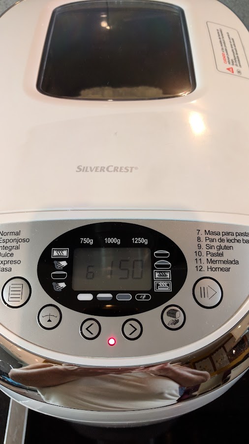 Pasado el tiempo encendemos y programamos menú horno (12) tostado fuerte. Cuando faltan 10 ó 15 minutos tapamos con papel aluminio para que quede más dorada la superficie. En cuanto acaba, sacamos la cubeta de la panificadora
