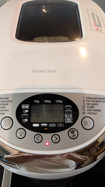Programamos menú masa, 6 en la panificadora de Lidl. Cuando suenen los primeros pitidos añadimos los arándanos
