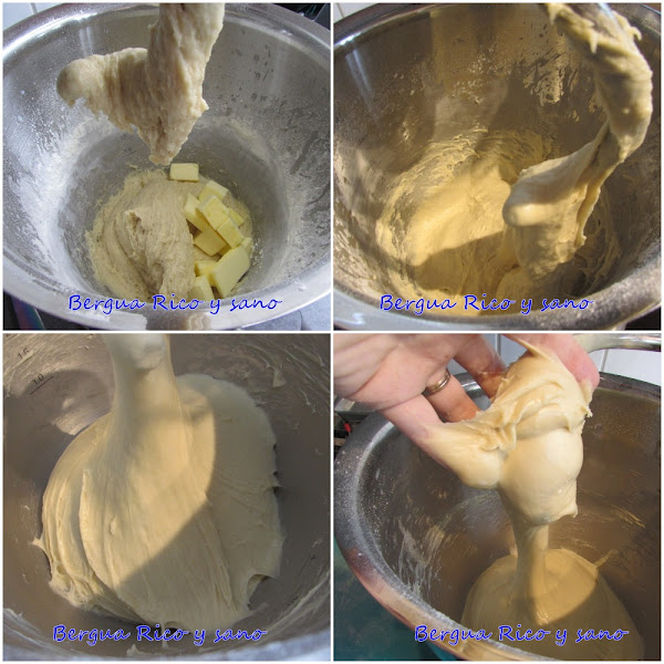 3. Añadimos la mantequilla fría; yo la corto en pedazos más pequeños para que sea más fácil integrarla con el resto de los ingredientes. Ahora hay que amasar muy muy bien para que quede una masa homogénea. Para que os hagáis una idea, a máquina me lleva unos 20 minutos a velocidad rápida, pero con las masas hay que tocar y valorar; no es cuestión de matemáticas. Es una masa pegajosa, pero al final quedará una masa manejable, que podremos manejar, sin ser firme. Si se pega mucho a las paredes del cuenco o a las manos, aún le queda. Cuando está lista, tiene un ademán de pegarse a la piel, pero se despega fácilmente y se puede manejar como si fuera blandiblu.
