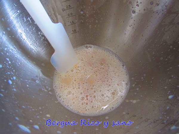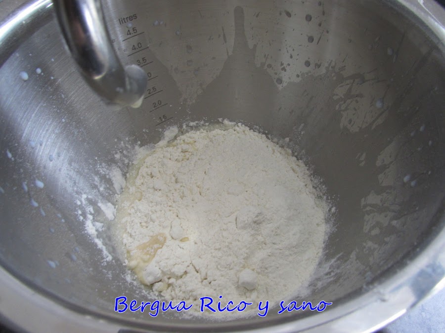 2. Incorporamos la harina mezclada con la sal. Como dihgo, yo no tengo muchas fuerzas y lo hice todo a máquina; así que aquí mezclé la harina con la leche para que coja cuerpo.