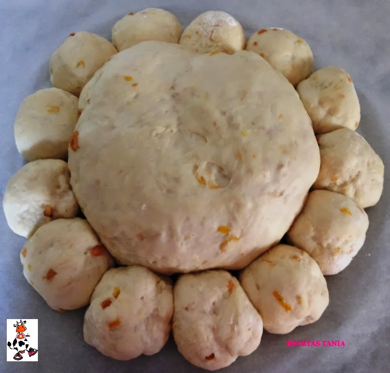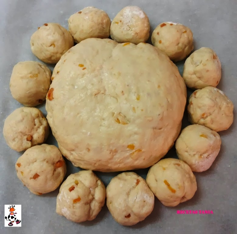 Formamos una bola y dejamos reposar, tapamos con un trapo húmedo durante una hora. Amasamos a mano para quitar el aire y formamos 13 bolitas de 30 gr y una bola con el resto de la masa.