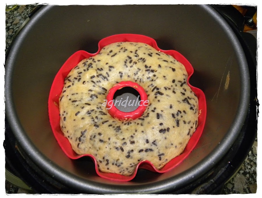 La masa sale bastante espesa, pero es normal; la coloqué en un molde de silicona y seleccionar menu horno durante 45 minutos, dejé reposar 10 dentro de la máquina.