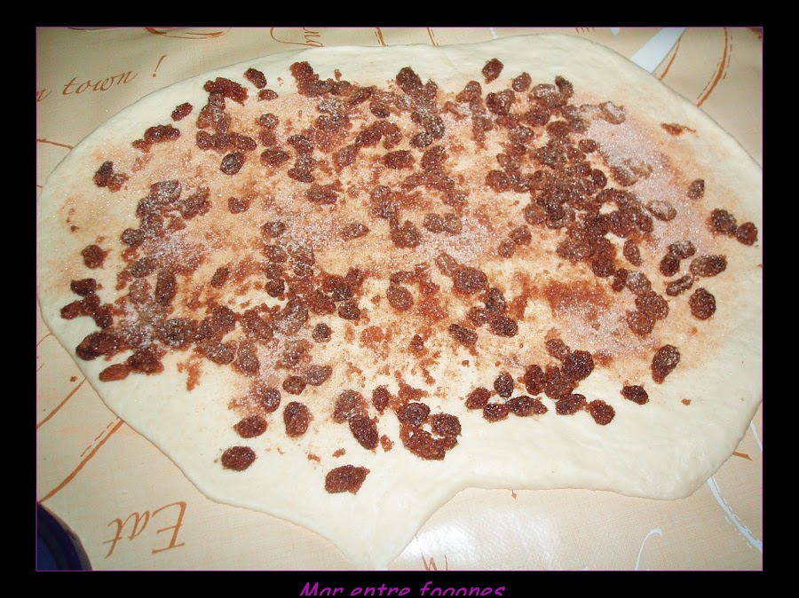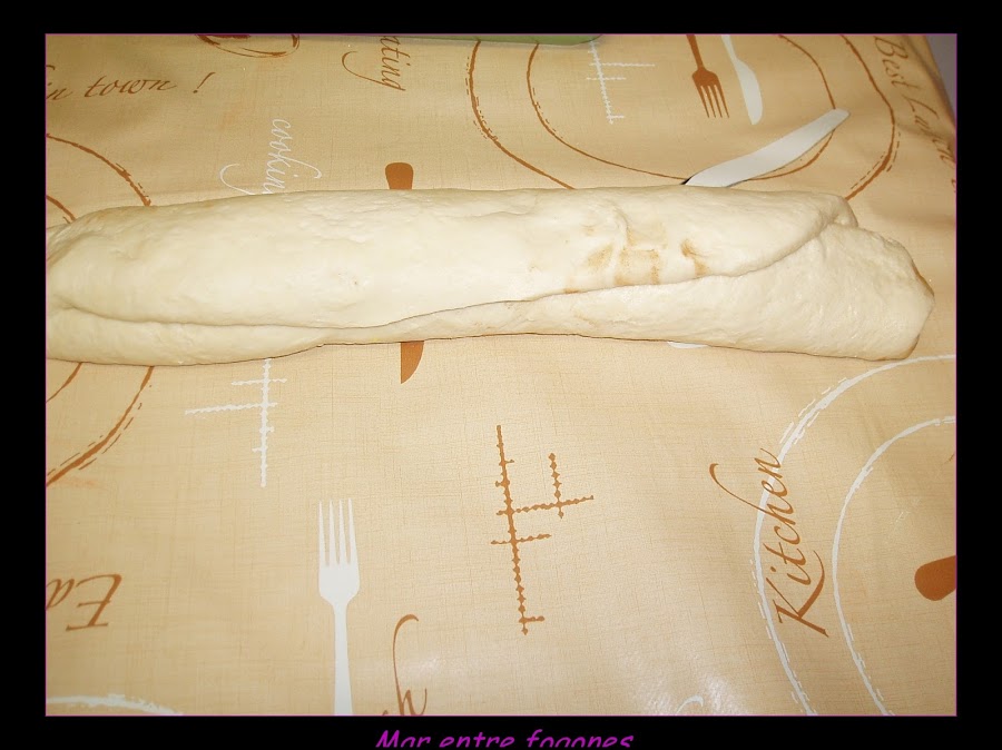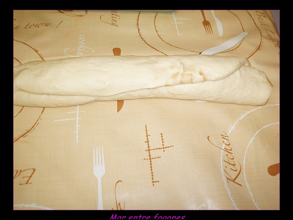 Una vez haya fermentado la masa y haya aumentado de volumen volvemos a amasar ligeramente y la estiramos bien formando un gran rectángulo.