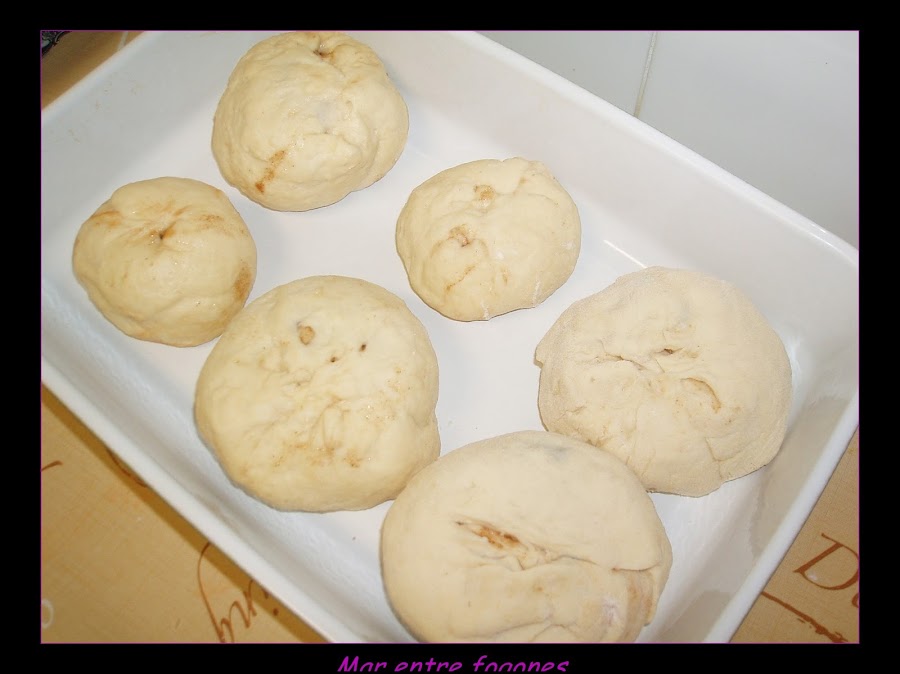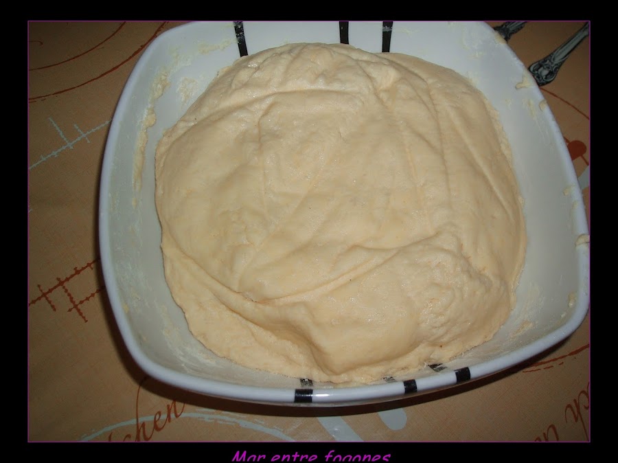 Dejamos fermentar de nuevo hasta que doble el volumen (yo para adelantar tiempos de levado y evitar problemas con él pongo el horno a la temperatura mínima que deja y espero unos 10-15 minutos. Meto la fuente y apago el horno. Lo dejo dentro hasta que doble el volumen sin abrir el horno). Una vez haya doblado el volumen enciendo el horno (sin sacarlo) y dejamos hornear hasta que esté cocinado mas o menos 25 minutos, dependiendo de cada horno. ( yo lo puse arriba y abajo y con aire).
