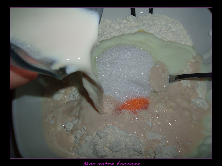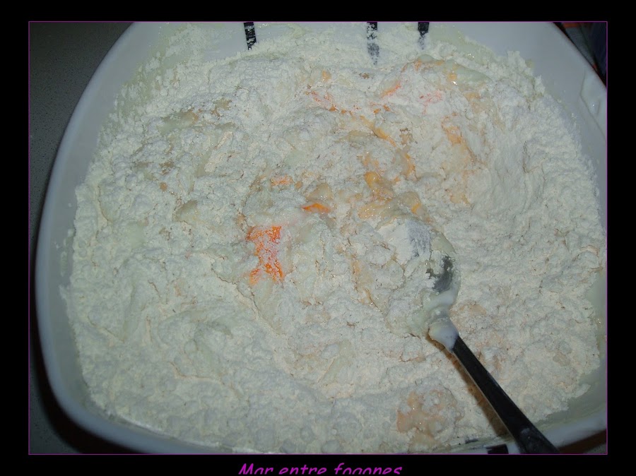 Cuando está todo bien batido añadimos la sal y la harina. poco a poco mientras vamos mezclando.