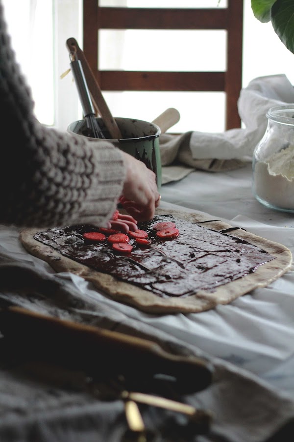 Por sí solo está de escándalo, pero esta vez quería hacerlo diferente y aprovechando el movimiento #fresasaporron de instagram , quise rellenar esta esponjosa masa con fresas, pistachos y un fundente chocolate al limón que lo hacen irresistible.