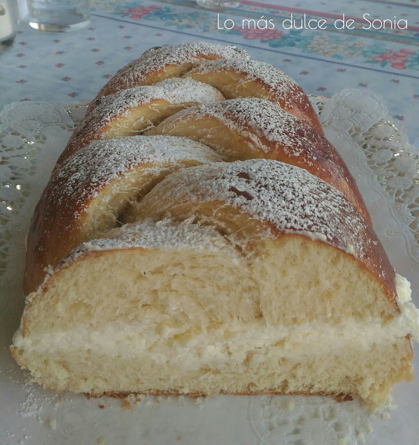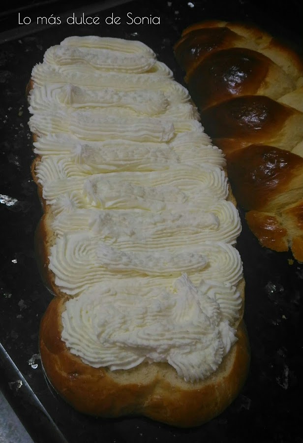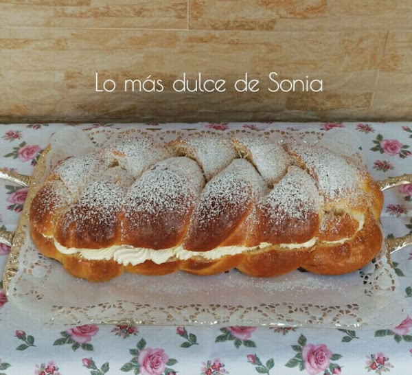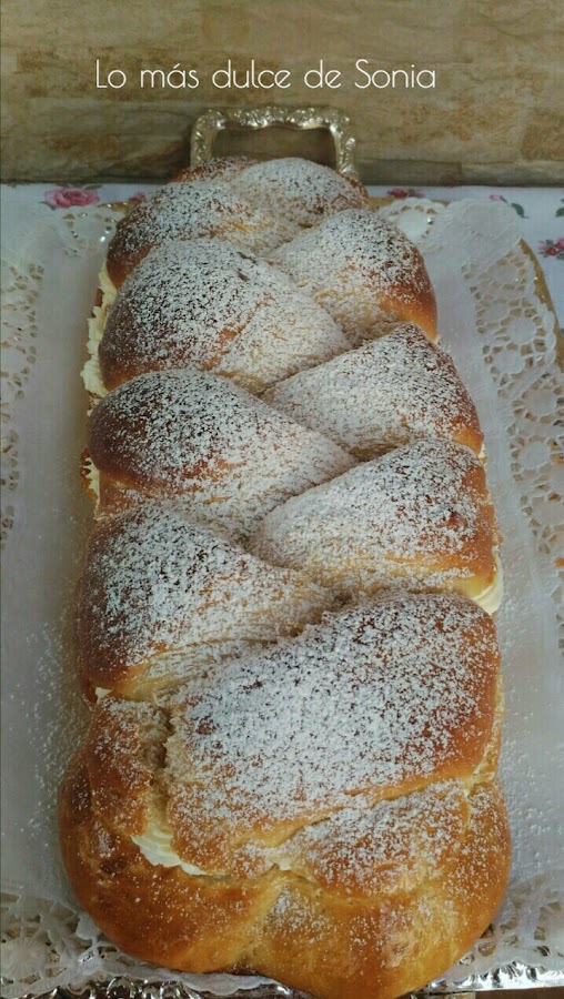 Yo rellene la trenza de nata montada (crema de leche) y espolvoree con azúcar glass. Riquisima!!!!