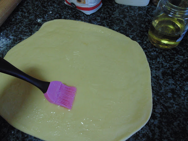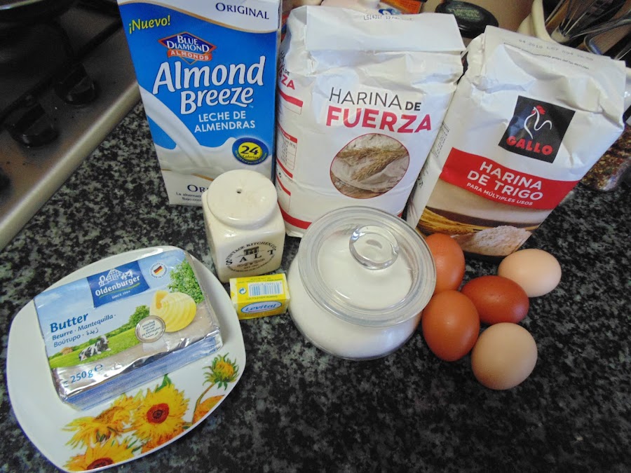 En primer lugar disolvemos la levadura en la leche de almendras tibia. En una amasadora o bien a mano, añadimos la harina y luego le agregamos la mezcla de la leche. Luego vamos añadiendo el azúcar y la sal.