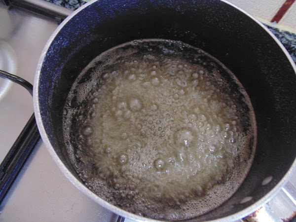 Mientras, preparamos el almíbar mezclando el agua, el azúcar y la esencia de vainilla. Cocemos a fuego medio hasta lograr una textura espesa.