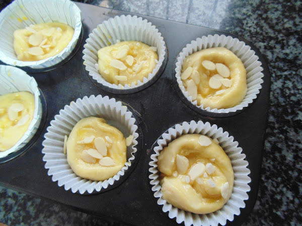 La pintamos con el almíbar y la enrollamos modo brazo gitano. La cortamos en rodajas y las ponemos en cápsulas de muffins. Pintamos con huevo y decoramos con azúcar perlado y almendras.