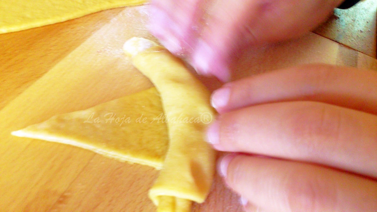 Mojar las puntas de los triangulos con un poco de agua con un pincel. Enrollar empezando desde la base abriendo un poco, delicadamente si no se va a romper la masa, el corte que hicimos y enrollar hasta llegar a la punta. Curvar dándole la forma del cruasán teniendo cuidado en mantener la punta en la parte baja (esto truco evitará que el cruasán se abra).