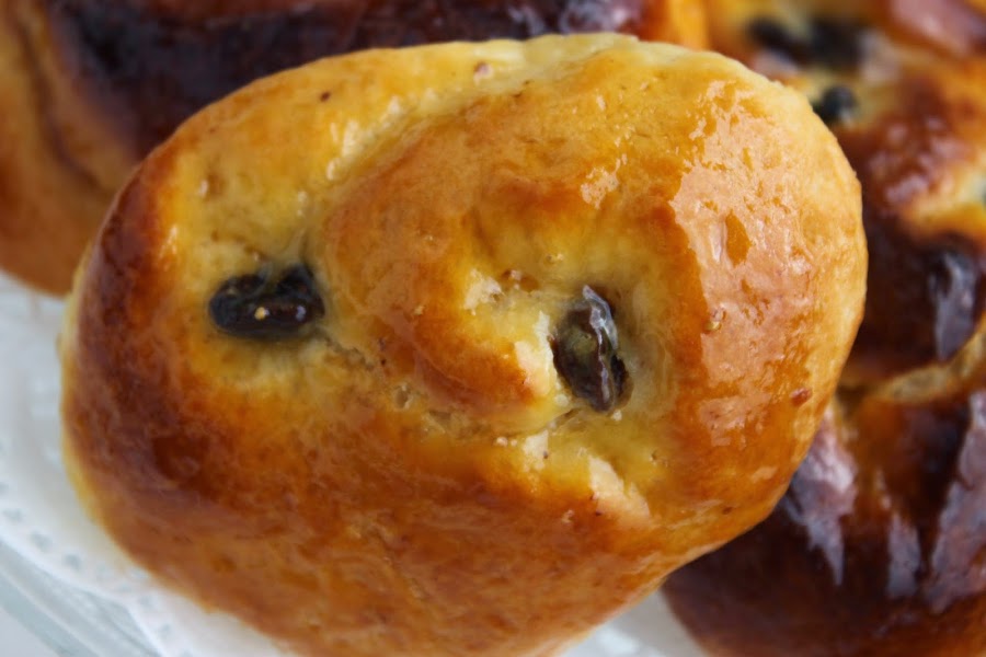 Extender la crema sobre ella y a continuación añadir las pasas sobre esta; formar un rulo procurando que no se salga la crema y que queden los bordes sellados, colocarlo sobre papel de hornear y meter en el congelador durante, unos 30´, sacar y cortar el rulo en trozos de unos 25cm +o-. colocarlos sobre bandeja de horno con papel, cubrir con paño y dejar que leve hasta que duplique volumen.