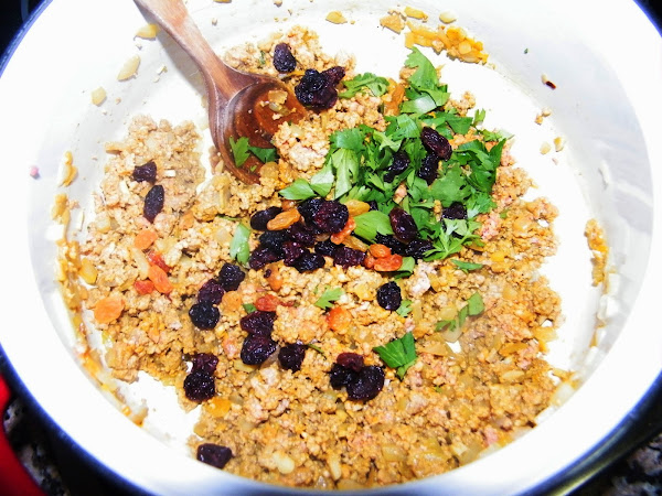 2. Cuando la cebolla está tierna, añadimos el picadillo, vamos separando la carne y añadimos las especias, las pasas y la harissa. Mezclamos bien.