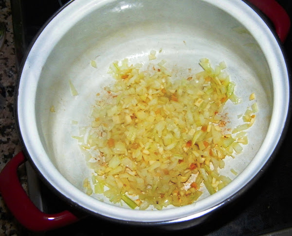 1. Primero vamos a preparar el relleno. Lo podemos dejar hecho incluso el día anterior. Picamos muy finito la cebolla, el ajo y el jengibre (si lo usamos fresco). Los rehogamos con una cucharada de aceite de oliva.